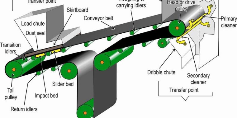 Băng tải được cấu tạo chủ yếu từ 2 puli trở lên và dây băng tải đóng vào ống quấn chặt. Ròng rọc dẫn động cho băng tải quay được gọi là puli dẫn động; ròng rọc chỉ thay đổi hướng chuyển động của băng tải được gọi là ròng rọc đảo chiều hay ròng rọc chạy không tải. Khi làm việc, puli dẫn động được động cơ truyền động thông qua bộ giảm tốc, băng tải quay nhờ lực ma sát giữa puli dẫn động và băng tải. Các puli dẫn động thường được lắp ở đầu xả để tăng lực kéo.
